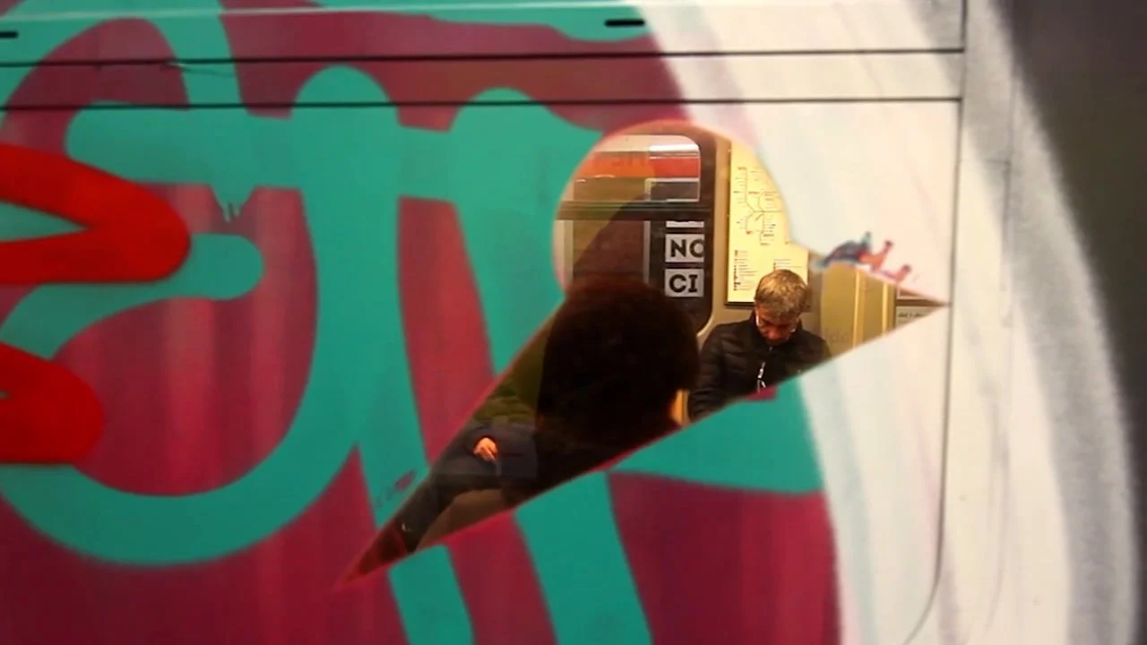 This series is comprised of works that focus on the interaction between graffiti on the metro and those who ride the metro. The works in this series were created by temporarily applying several metal shapes to the windows of a metro carriage. The entire metro carriage was spray painted, after which the metal was removed and taken back to the artists' studio to be attached to a large metal canvas. This process was repeated several times. The trains were left to commence their daily routine of picking up and dropping off passengers, with only the gaps in graffiti (left behind by the removal of the metal) to serve as windows. To the people inside the metro carriage, the outside world and those in it are outlined by the graffiti. Conversely, to any bystander on the platform it appears as if the graffiti is framing those inside the train. It is impossible to look at the spray painted metro carriage from either side of the window without seeing both the paint and the people whom it is surrounding. Consequently, everyone who witnesses the graffiti becomes a part of it's aesthetics to whoever else is also viewing it.
